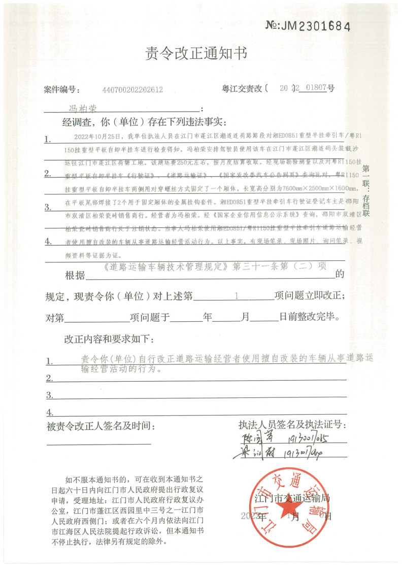 你(单位)因违反交通运输行政管理法规,本机关已作出行政处罚决定和责令改正通知书(具体内容详见附件)。依照《中华人民共和国民事诉讼法》第九十二条的规定,因受送达人采用其他方式无法送达,现向你(单位)公告送达《行政处罚决定书》和《责令改正通知书》。自公告之日起,经过30日即视为送达。