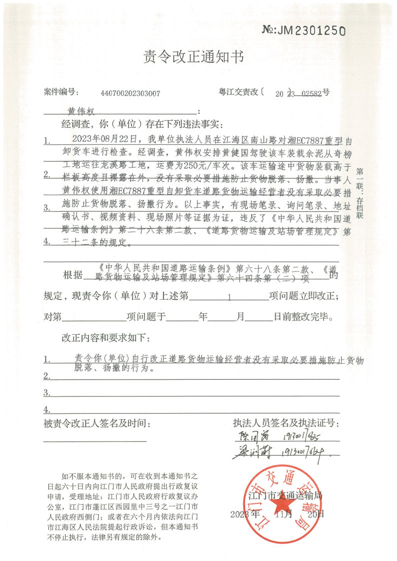 你(单位)因违反交通运输行政管理法规,本机关已作出行政处罚决定和责令改正通知书(具体内容详见附件)。依照《中华人民共和国民事诉讼法》第九十二条的规定,因受送达人采用其他方式无法送达,现向你(单位)公告送达《行政处罚决定书》和《责令改正通知书》。自公告之日起,经过30日即视为送达。