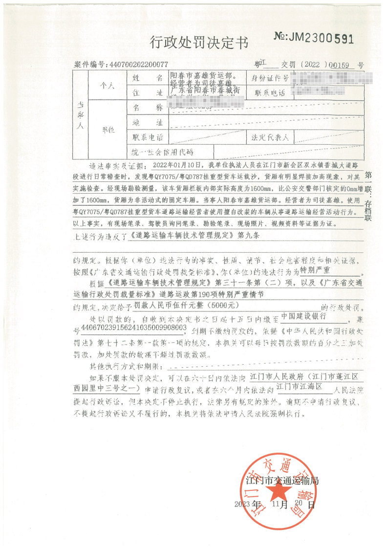 你(单位)因违反交通运输行政管理法规,本机关已作出行政处罚决定和责令改正通知书(具体内容详见附件)。依照《中华人民共和国民事诉讼法》第九十二条的规定,因受送达人采用其他方式无法送达,现向你(单位)公告送达《行政处罚决定书》和《责令改正通知书》。自公告之日起,经过30日即视为送达。