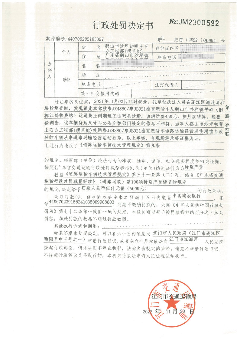 你(单位)因违反交通运输行政管理法规,本机关已作出行政处罚决定和责令改正通知书(具体内容详见附件)。依照《中华人民共和国民事诉讼法》第九十二条的规定,因受送达人采用其他方式无法送达,现向你(单位)公告送达《行政处罚决定书》和《责令改正通知书》。自公告之日起,经过30日即视为送达。