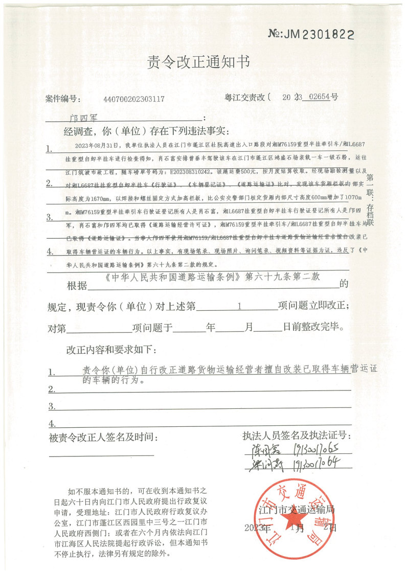 你(单位)因违反交通运输行政管理法规,本机关已作出行政处罚决定和责令改正通知书(具体内容详见附件)。依照《中华人民共和国民事诉讼法》第九十二条的规定,因受送达人采用其他方式无法送达,现向你(单位)公告送达《行政处罚决定书》和《责令改正通知书》。自公告之日起,经过30日即视为送达。