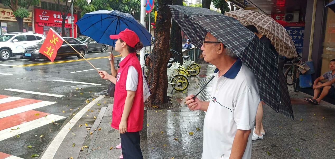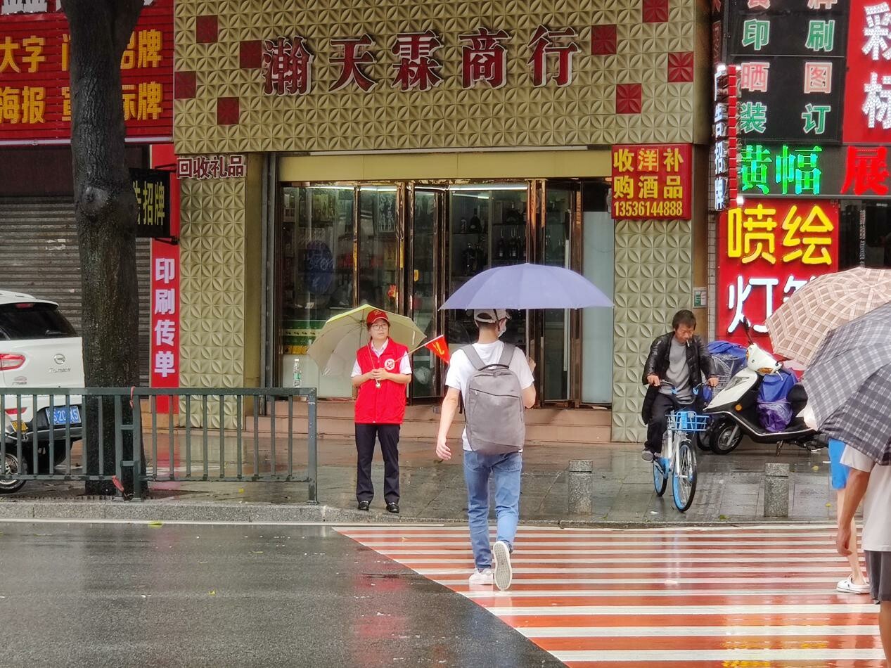 虽然连续下着大雨,但文明交通劝导志愿者一直头戴红色小帽,身穿志愿服装,举着“礼让”小红旗,在胜利社区农林岗交通路口指导行人走斑马线、劝导非机动车不逆行等。当红灯亮起,伸臂挥旗,在斑马线前拦出一条安全线;当绿灯亮时,放下旗子,放行身后人群,引导路人沿斑马线有序通过马路。文明交通劝导志愿者的一举一动虽然简单,却让每一位交通参与者在平安出行的同时,感受到这座城市的文明气息。