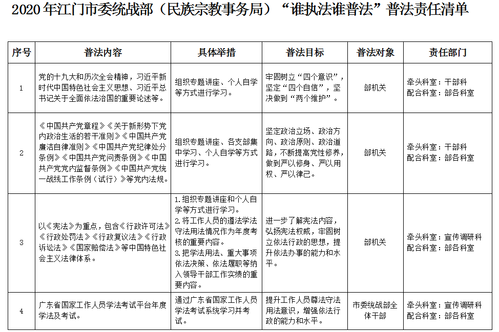 《2020年江门市委统战部(民族宗教事务局)谁执法谁普法普法责任清单》