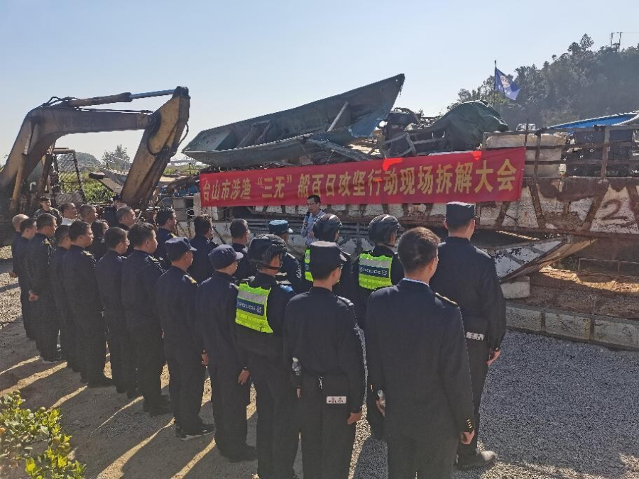 12月7日,市海洋综合执法支队支队长汪炳康带队到赤溪镇曹冲码头参加台山市涉渔“三无”船舶拆解现场会,对百日攻坚专项行动期间依法没收并完成公示等流程的75艘涉渔“三无”船舶进行公开集中拆解处置。