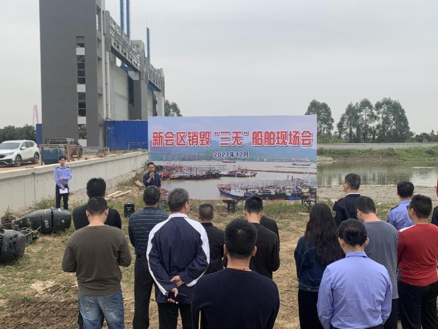 12月13日,市海洋综合执法支队副支队长钟树年带队到新会区双水镇参加涉渔“三无”船舶拆解现场会,对前期依法没收并完成公示等流程的35艘涉渔“三无”船舶进行公开集中拆解处置。