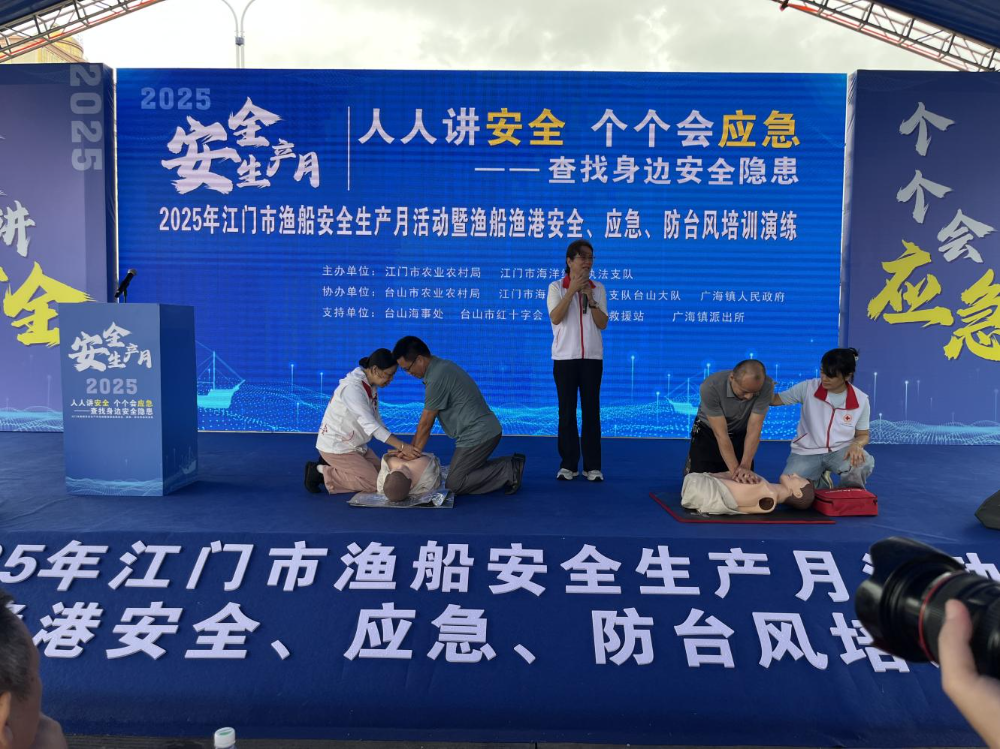 6月17日,2025年江门市渔船安全生产月活动暨渔船渔港安全、应急、防台风培训演练在台山广海渔港举办。江门市农业农村局、市海洋综合执法支队、台山市农业农村局、台山海事处、台山市红十字会、广海镇政府、广海消防站、广海镇派出所派员参加。广海及周边镇村国库渔船、乡镇自用船船东船长船员300余人现场学习观摩。