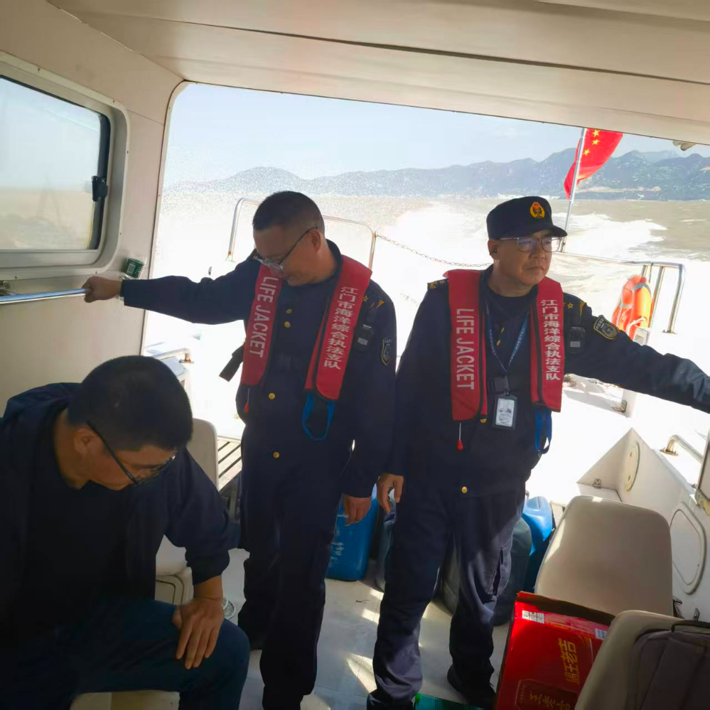 11月19日,市海洋综合执法支队渔业执法科(机动大队)出动粤海洋执法66023艇到蓬江区棠下、潮连等地开展水上执法巡航行动,重点打击临水作业不按规定穿着救生衣行为。