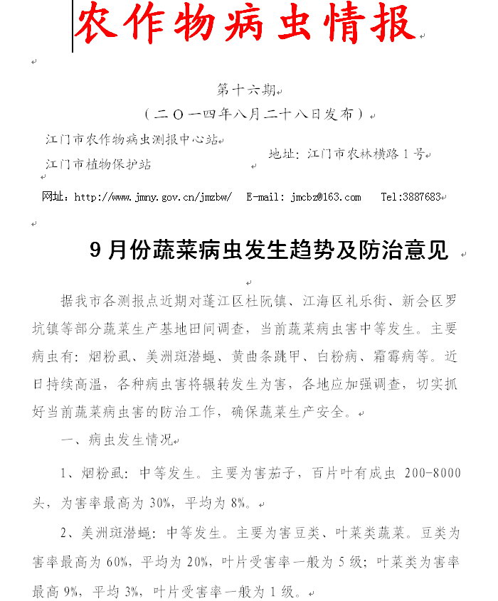 (9月份蔬菜病虫发生趋势及防治意见)