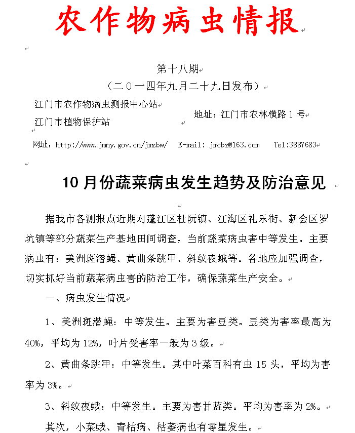 2014年农作物病虫情报第十八期(10月份蔬菜病虫发生趋势及防治意见)