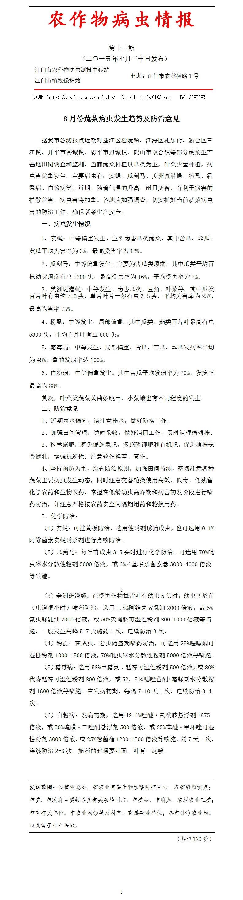 2015年农作物病虫情报第十二期(8月份蔬菜病虫发生趋势及防治意见)