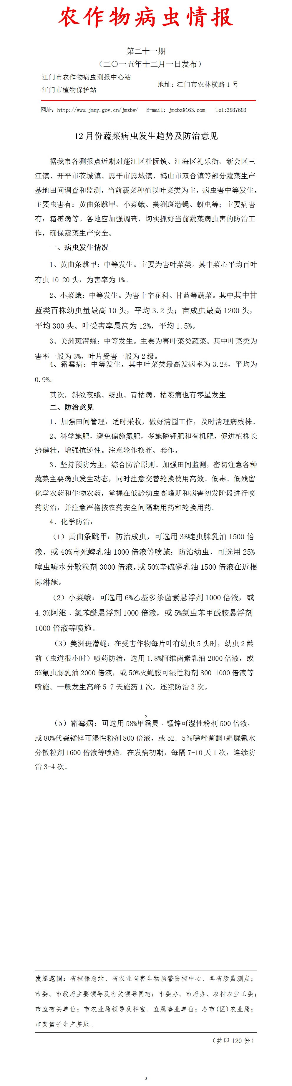 2015年农作物病虫情报第二十一期(12月份蔬菜病虫发生趋势及防治意见)