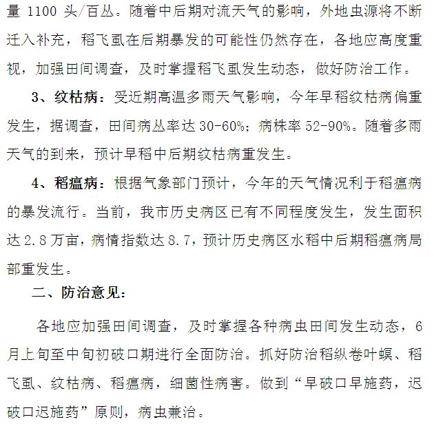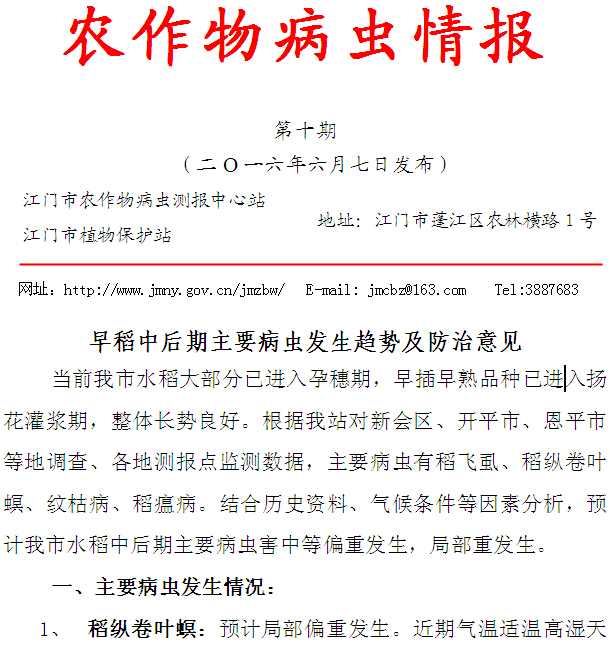 2016年农作物病虫情报 第十期(早稻中后期主要病虫发生趋势及防治意见)