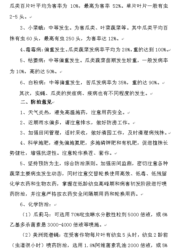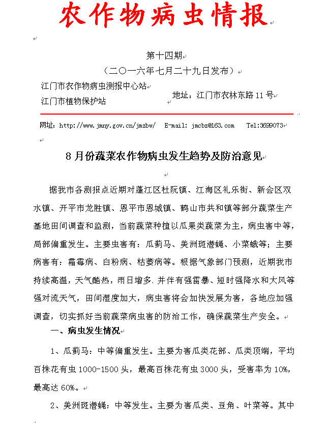 2016年农作物病虫情报 第十四期(8月份蔬菜农作物病虫发生趋势及防治意见)
