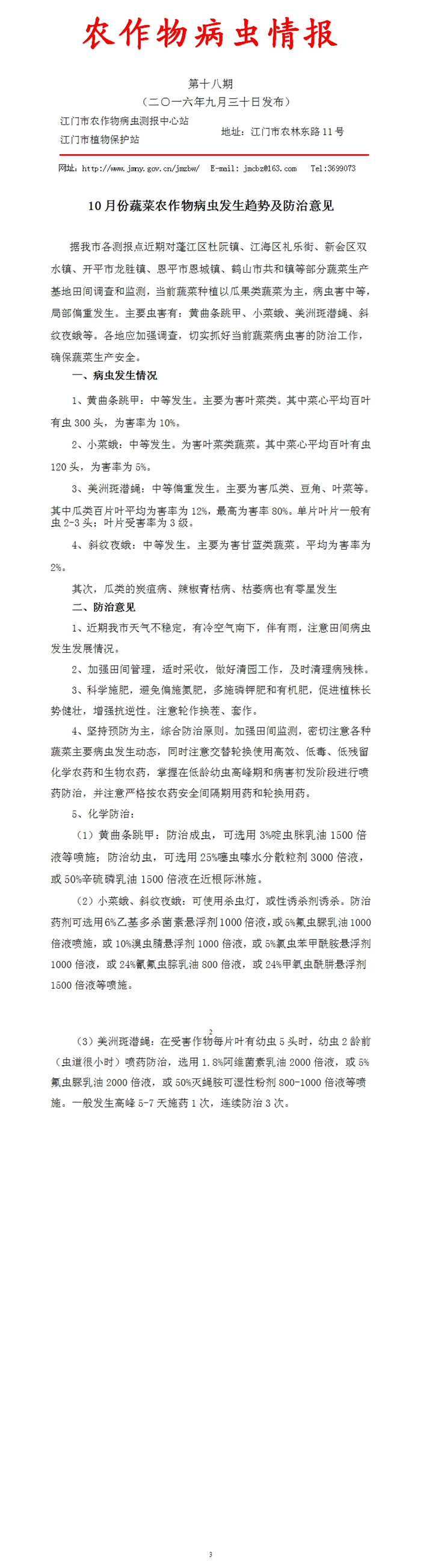 2016年农作物病虫情报 第十八期(10月份蔬菜农作物病虫发生趋势及防治意见)