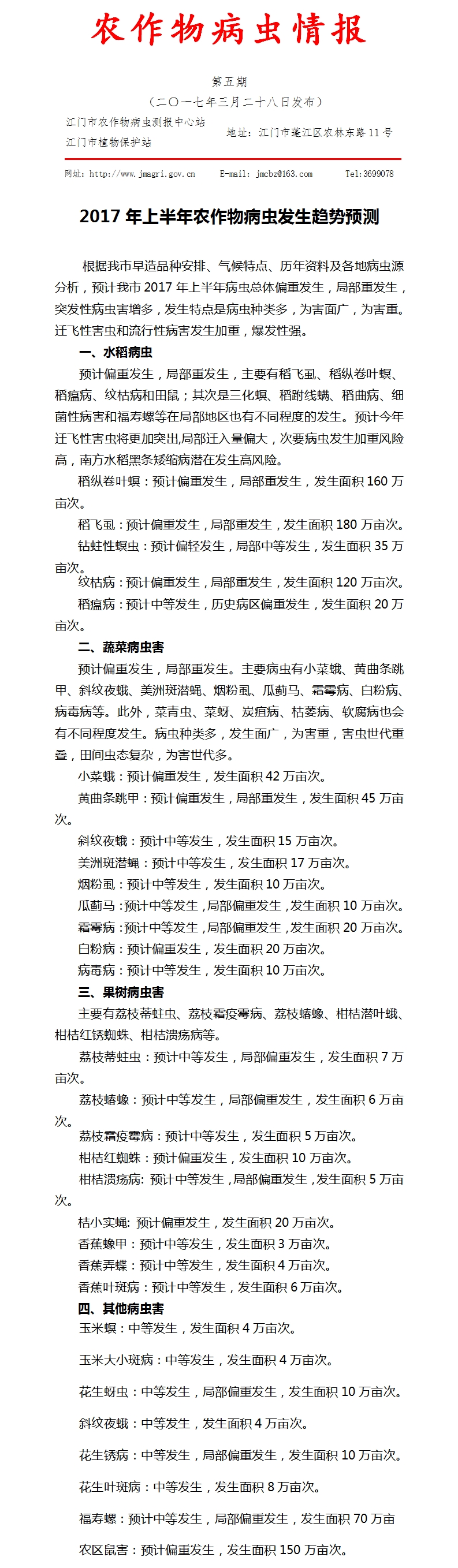 2017年农作物病虫情报 第五期(2017年上半年农作物病虫发生趋势预测)