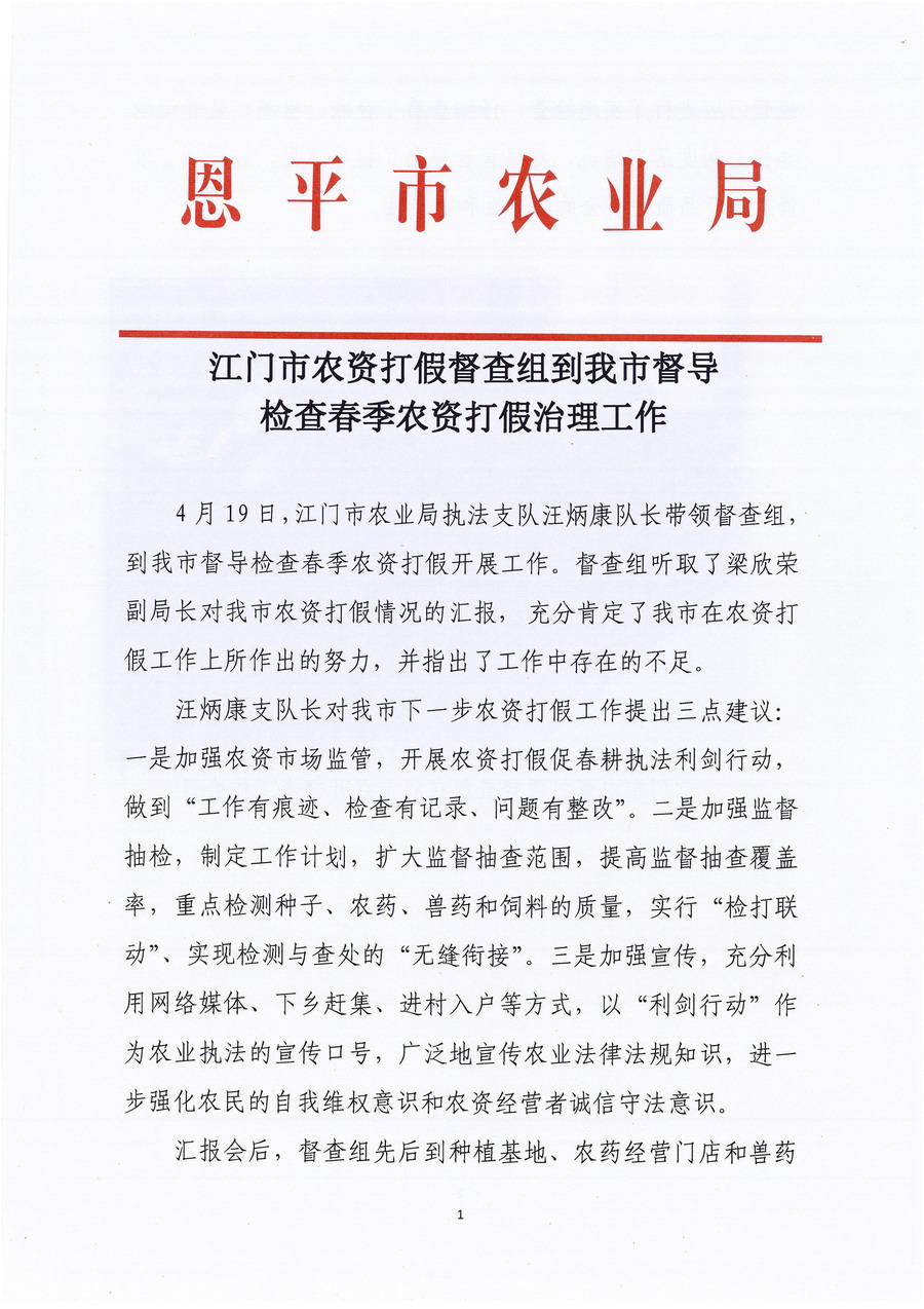 江门市农资打假督查组到我市督导检查春季农资打假治理工作