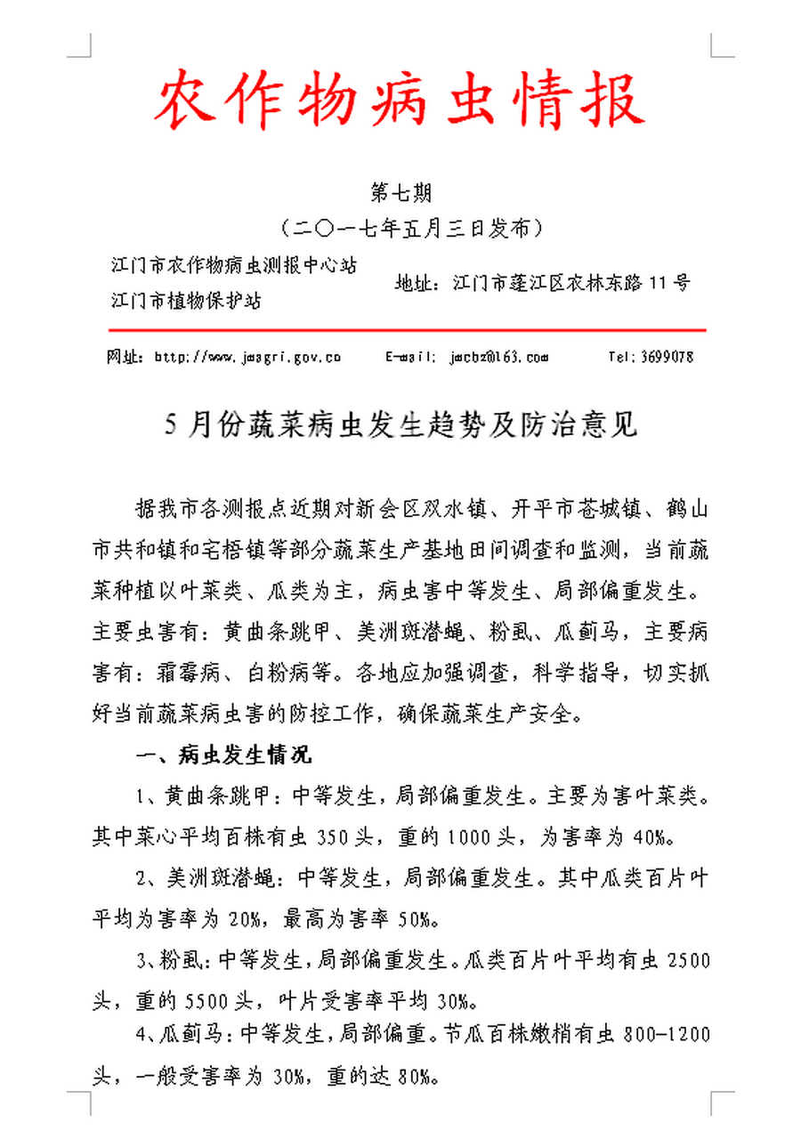 2017年江门市农作物病虫情报 第七期(5月份蔬菜病虫发生趋势及防治意见)