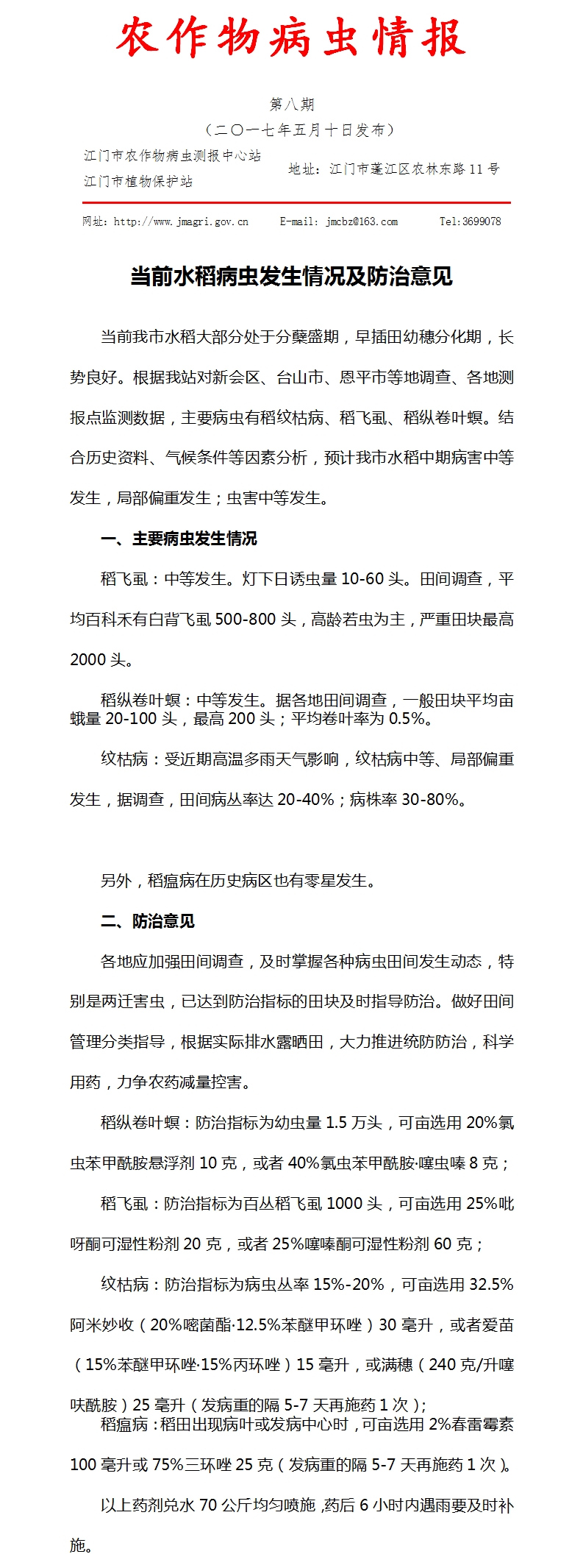2017年江门市农作物病虫情报 第八期(当前水稻病虫发生情况及防治意见)