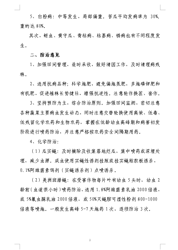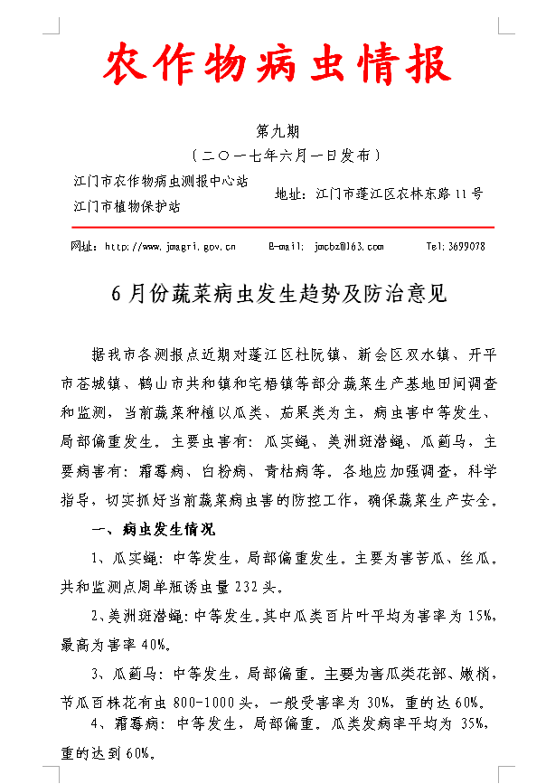 2017年江门市农作物病虫情报 第九期(6月份蔬菜病虫发生趋势及防治意见)
