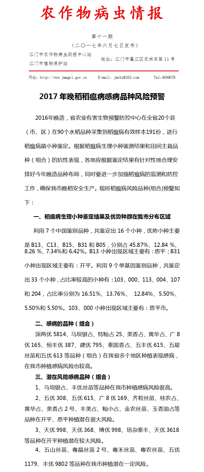 2017年江门市农作物病虫情报 第十一期(晚稻稻瘟病感病品种风险预警)
