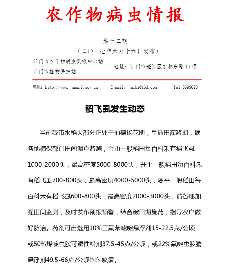 2017年江门市农作物病虫情报 第十二期(稻飞虱发生动态)