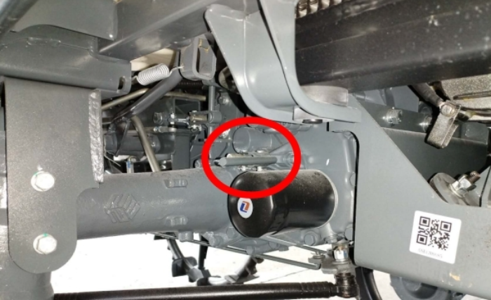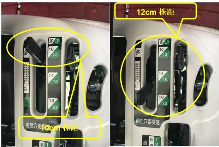 如需调整为10cm株距,穴距调节手柄(见上图)拨至“10/18”位置,然后将穴距宽窄切换手柄(见下图)拨至“前方”位置,如需调整为18cm株距,穴距调节手柄拨至“10/18”位置,然后将穴距宽窄切换手柄拨至“后方”位置。