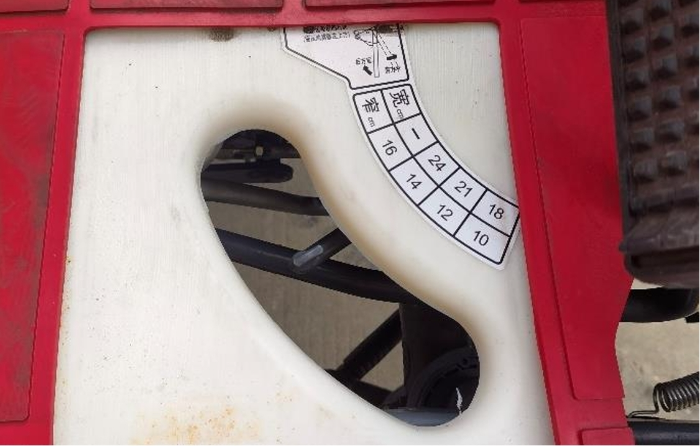 如需调整为14cm株距,穴距调节手柄(见上图)拨至“14/24”位置,然后将穴距宽窄切换手柄(见下图)拨至“前方”位置,如需调整为24cm株距,穴距调节手柄拨至“14/24”位置,然后将穴距宽窄切换手柄拨至“后方”位置。