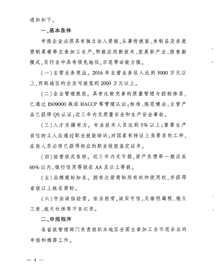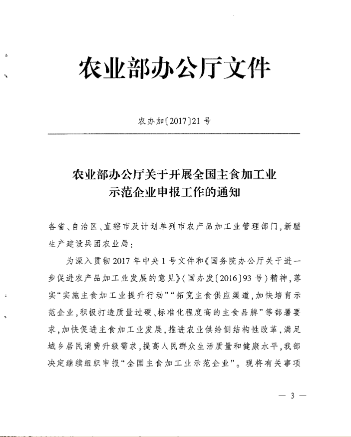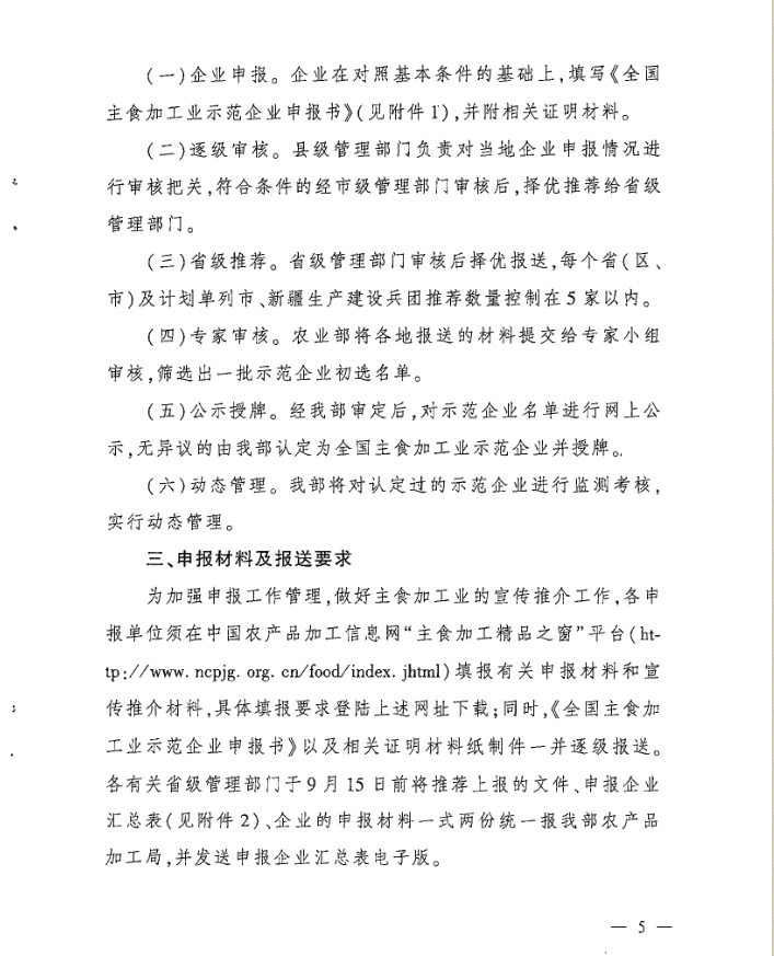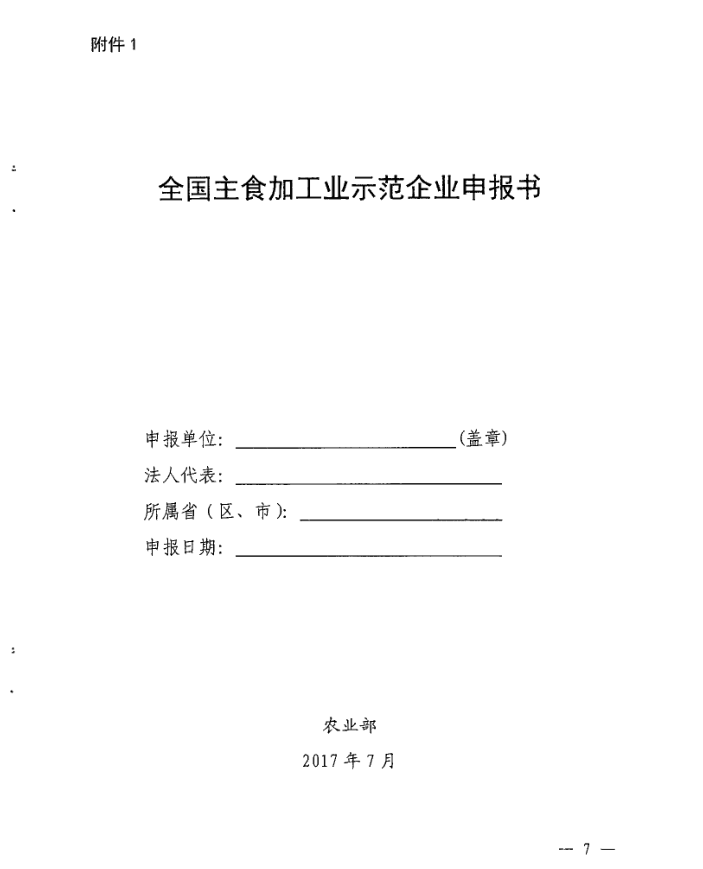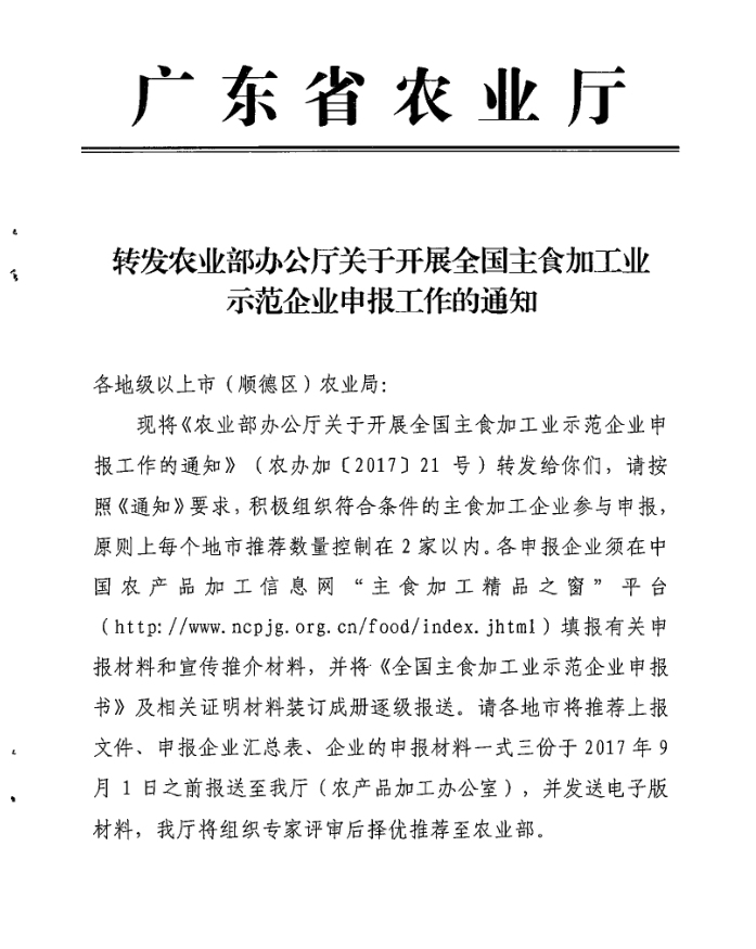 转发农业部办公厅关于开展全国主食加工业示范企业申报工作的通知