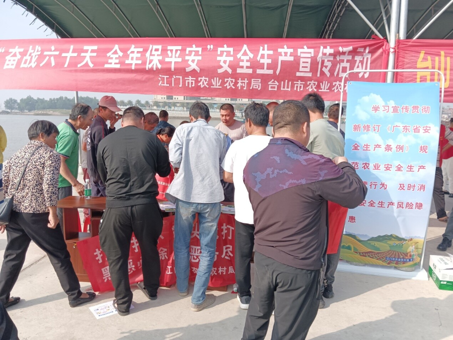 为深入学习贯彻习近平总书记关于安全生产重要论述精神,深刻吸取近期有关安全事故教训,有效防范和遏制各类农业生产安全事故,扎实推进安全宣传“五进”工作。12月12日,我局联合台山市农业农村局在台山市广海镇渔港举办农业“奋战六十天 全年保平安”安全生产宣传活动。活动现场,工作人员通过设置咨询台、分发小册子、悬挂宣传横幅等方式,传播安全生产、防灾减灾救灾、森林防灭火和应急逃生、自救互救等应急知识,为现场人民群众广泛普及农药安全使用、渔业船舶、火灾、防电、防雷、防台风等安全知识,有效提高人民群众的基本安全技能,强化安全防范意识,进一步夯实了安全生产的人民群众基础。