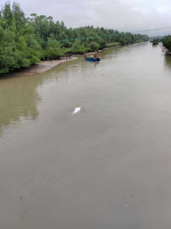 6月5日9时,110指挥中心转报,在新会区崖门镇广州华立学院江门校区旁的田边冲水道内发现一头中华白海豚,当时正值退潮,中华白海豚存在搁浅危险。
