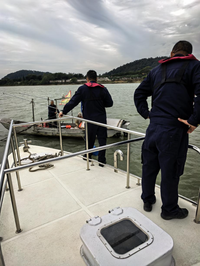 11月19日,市海洋综合执法支队渔业执法科(机动大队)出动粤海洋执法66023艇到蓬江区棠下、潮连等地开展水上执法巡航行动,重点打击临水作业不按规定穿着救生衣行为。