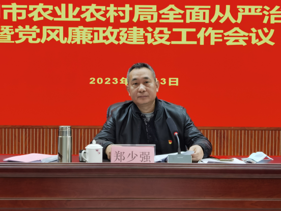 郑少强指出,要坚持内容上全涵盖、对象上全覆盖、责任上全链条、制度上全贯通,一刻不停推进农业系统全面从严治党,持续加固严守中央八项规定及其实施细则精神堤坝,科学精准靶向整治形式主义、官僚主义问题,严明纪律规矩,深化标本兼治、系统治理,一体推进不敢腐、不能腐、不想腐。深入贯彻党中央、省、市提出的重点任务、重点举措、重要政策、重要要求,切实担当职责使命。全面加强党的纪律建设,开展经常性纪律教育,严格执行党的各项规章制度,努力提高党员干部的法纪意识,发挥警示和示范作用。加强党性教育、政德教育、警示教育和家风教育,推进新时代廉洁文化建设,构建清廉社会生态。从严从实强化对年轻干部教育管理监督,督促领导干部严于律己、严负其责、严管所辖,形成全面覆盖、常态长效的监督合力。