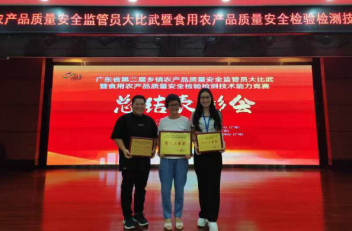 2024年9月,由市农业农村局牵头,市农检中心组织全市各乡镇12名技术骨干参加广东省第二届乡镇农产品质量安全监管员大比武暨食用农产品质量安全检验检测技术能力竞赛,竞赛分复赛和决赛阶段,经过激烈角逐,江门市代表队荣获团体二等奖,陆慧贞(鹤山市古劳镇农业综合服务中心)和潘玲玲(新会区罗坑镇农业农村办公室)分别获得兽残和农残检测方向个人三等奖。