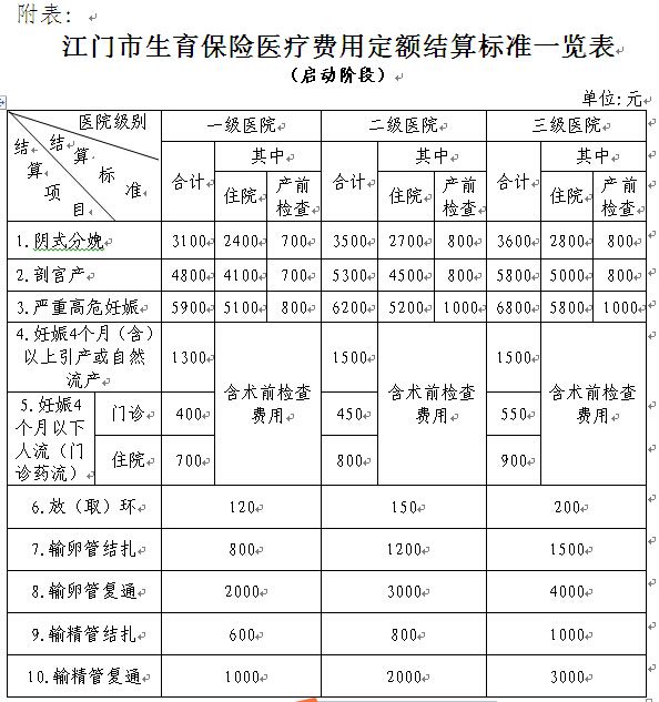 生育保险医疗费用定额结算标准(以下简称定额结算标准),由江门市人力资源和社会保障局(以下简称市人力资源社会保障局)根据近3年生育医疗费用水平、生育保险基金收支状况以及定点医疗机构级别等因素综合确定,并根据社会经济发展水平、费用合理增长水平和国家、省、市有关政策变动情况作适时调整,一般每3年调整一次。2015年1月1日至2016年6月30日为启动阶段,启动阶段期间,江门市生育保险医疗费用定额结算标准一览表详见附表,2016年7月1日后,根据生育保险“以支定收,收支平衡”的原则,结合各级别生育定点医疗机构上年度实际发生的平均生育医疗费用情况进行调整。