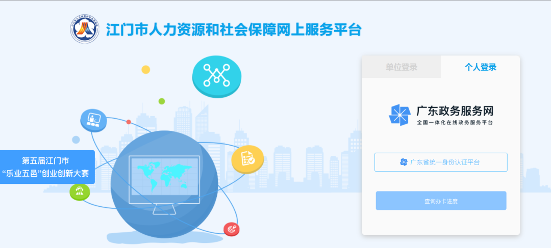(五)浏览器输入报名网址://rsfw.jiangmen.cn/Jmqyfwpt/index.do,进入江门市人力资源和社会保障网上服务平台;