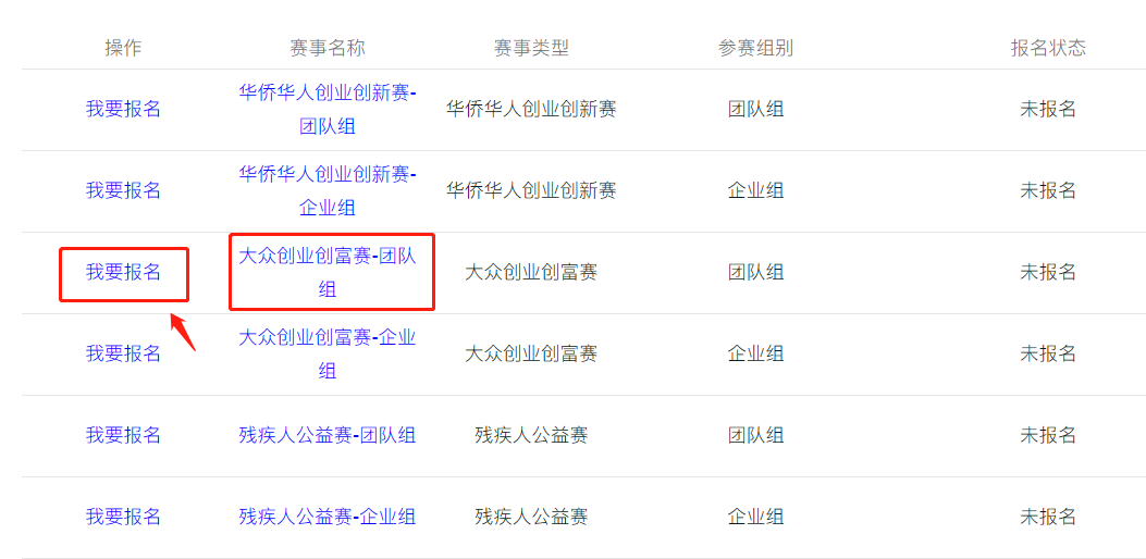 (十)选择所需报名的赛事,以“大众创业创富赛—团队组”为例,点击左侧【我要报名】;
