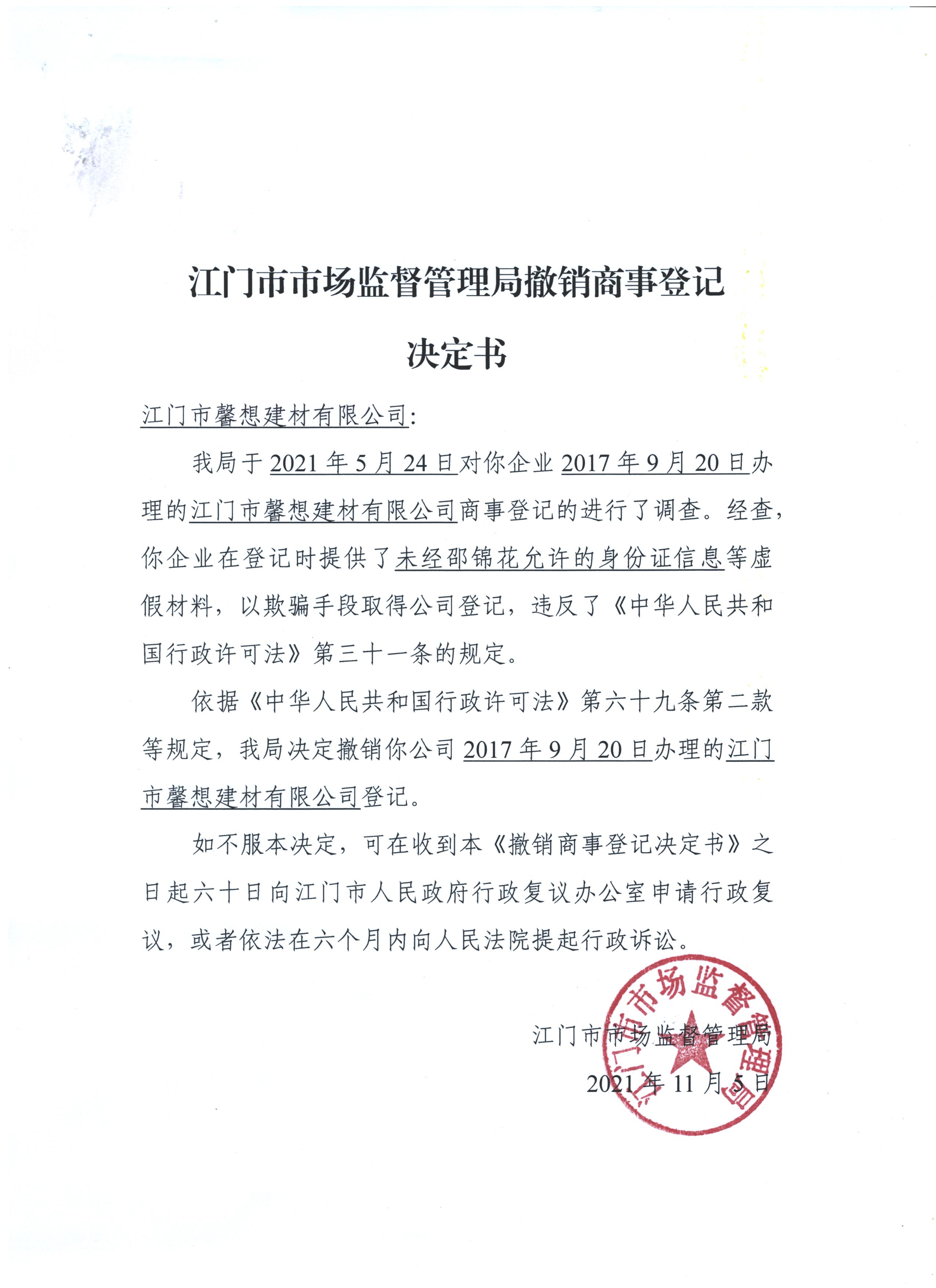 江门市市场监督管理局撤销商事登记决定书(江门市馨想建材有限公司)