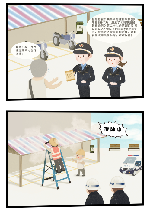 随着我国城市化进程的不断推进, 城市建设有了长足的发展,但同时也出现了不少的违建现象,严重影响了城市的和谐发展。尤其在一些老旧社区,人们对违建的认知不深,误认为在自家门口或楼顶搭建对他人影响不大、无须办理报批手续,违建现象屡见不鲜。违建行为不但侵蚀城市公共资源,影响城市形象,还会增加安全隐患。同时,擅自搭建建筑物、构筑物的行为,会受到相应的行政处罚。下面我们以漫画的形式以案说法: