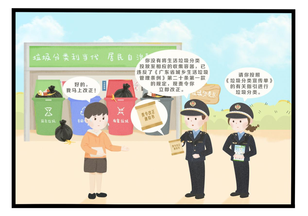 本期案例改编于白沙街道真实案例,白沙街道办事处执法人员在日常巡查过程中,发现辖区某居民未按垃圾分类的规定,随意倾倒、堆放了生活垃圾,违反了《广东省城乡生活垃圾管理条例》第二十条第一款的规定,执法人员向该居民发出责令改正通知书,要求现场立即改正。经核查,该居民已按规定分类投放垃圾,按《广东省城乡生活垃圾管理条例》第五十三条规定,依法对其从轻处罚。