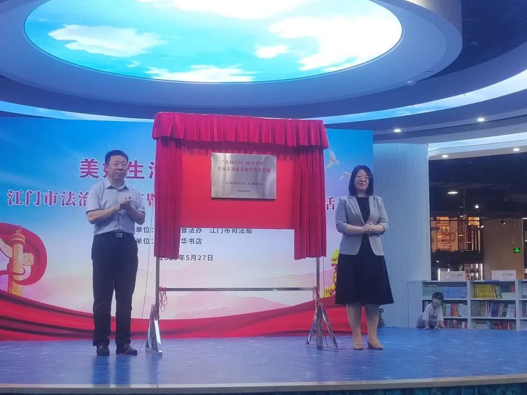 为进一步深入开展法治宣传教育,增强全民法治观念,提升公民法治素养,活动中,市司法局党组成员、副局长宋宗杰与江门新华书店总经理龚婷共同为“法润江门 阅享书香”公民法治素养提升教育基地揭牌。“法润江门 阅享书香”公民法治素养提升教育基地在江门购书中心挂牌,为江门市公民法治素养提升提供了实体平台,是对全方位开展“八五”普法、建设法治江门、推进法治赋能工作的又一次创新实践。