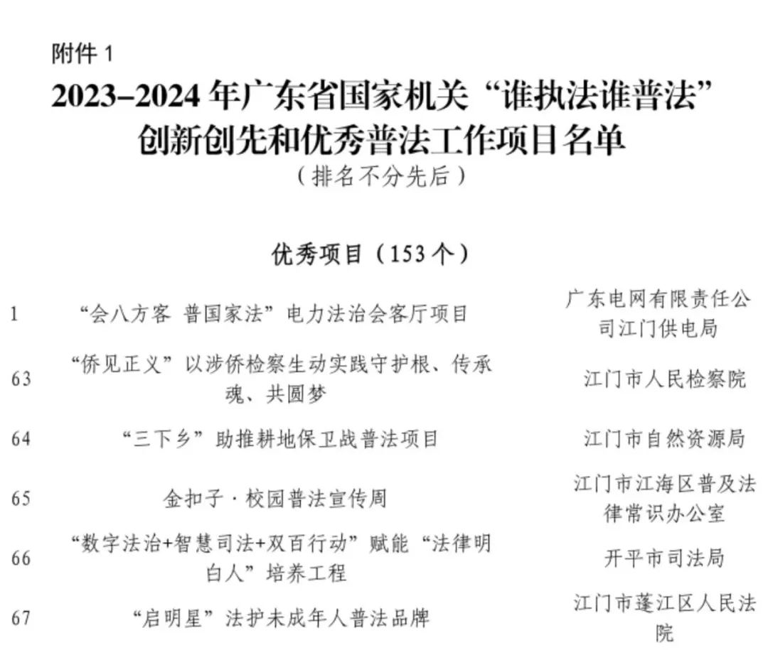 江门市6个项目获评全省国家机关“谁执法谁普法”优秀普法工作项目。