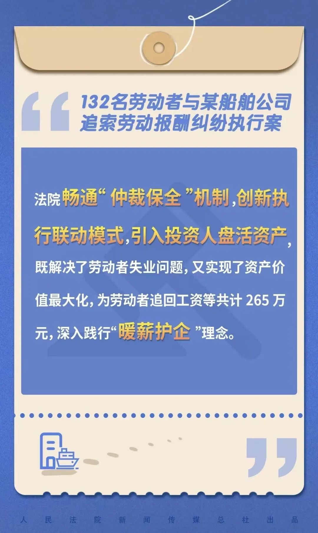 近日,最高人民法院发布涉欠薪纠纷典型案例,新会区法院“132名劳动者与某船舶公司追索劳动报酬纠纷执行案”入选。新会区法院积极发挥执行职能,畅通“仲裁保全”机制,加强与人社部门、属地镇政府的信息互通、沟通协作,发挥府院联动机制优势作用,创新执行联动模式,引入投资人盘活案涉机器设备并接手经营企业,解决劳动者失业问题,既实质化解欠薪难题,又深入践行 “暖薪护企”理念,服务经济社会发展大局。