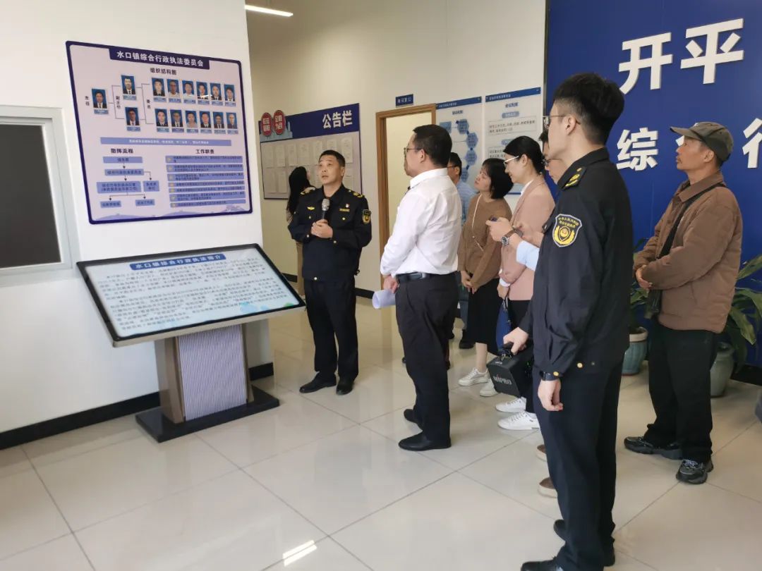 开平市水口镇综合行政执法办公室作为基层行政执法的一线部门,是江门市首批完成综合行政执法规范化建设的乡镇(街道)之一, 其整齐有序的办公环境、严谨规范的执法流程和创立的“党建引领+挂图作战+智慧执法+执检联动”执法模式,给参观人员留下了深刻印象。在讲解员的带领下,党员干部参观了执法信息公示区、行政调解室、案件研判室、执法办公室等,详细了解执法中心的日常运作和“粤执法”平台的使用情况。“粤执法”平台通过智能化网络系统,实现案件从立案、调查取证、审核决定到执行的全流程线上管理,做到严格依法依规办事,每个环节都彰显法治的严肃与公正,让党员干部深刻体会到法治在基层治理中的重要作用。