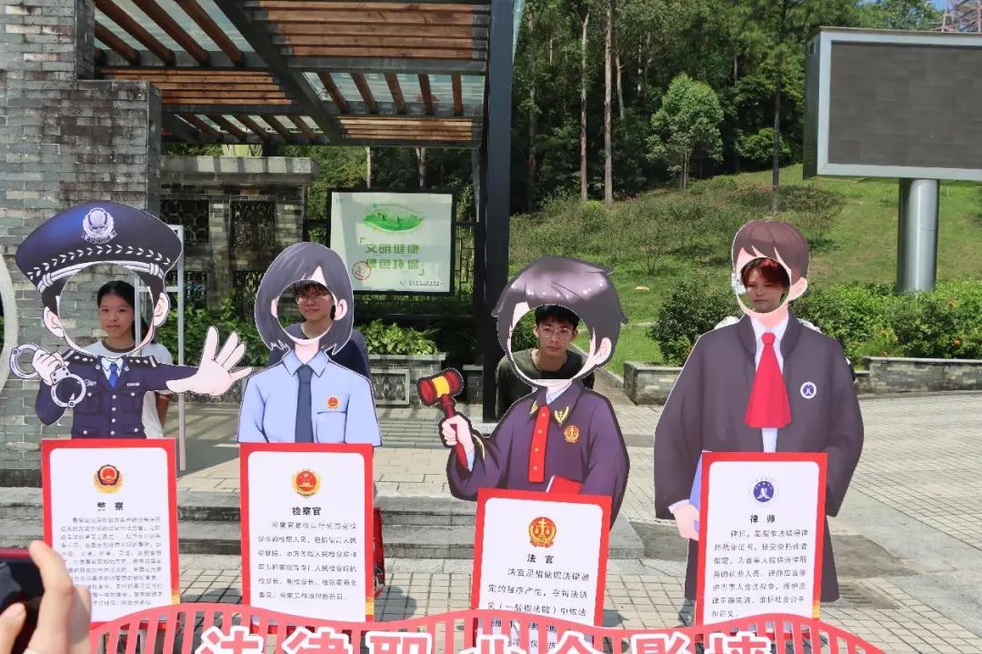 充分发挥现有法治长廊、法治阵地及各类爱国主义、新时代文明实践中心等基层宣教阵地普法功能,打造“法治+”多元要素青少年法治宣传教育基地,组织开展丰富多彩的法治、爱国主义、禁毒等主题实践活动,将法治教育从课堂出发延伸至校外空间,让同学们享受全天候多方位的法治文化盛宴。在恩平市法治文化公园开展“法治City Walk”游园会活动,将学习民法典等法律知识融入到游戏过程中,解锁学法新体验;组织师生走进恩平市人民法院“沉浸式”学法,“零距离”感受法治文化;组织师生到牛江镇昌梅村、君堂镇黎塘村的民主法治示范村体验研学之旅,漫步法治步行径和法治宣传栏、法律图书室等法治文化阵地,在法治氛围中厚植法律信仰、弘扬爱国精神。