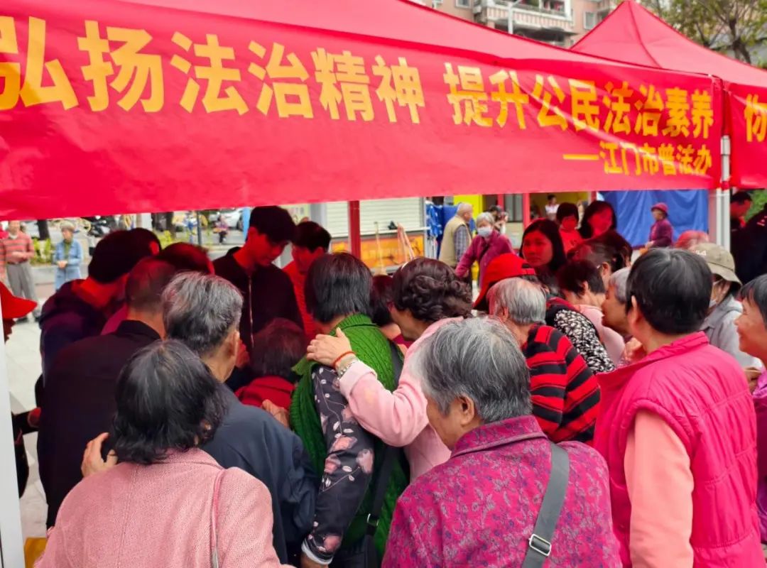舞台上,文艺团队轮番登场,演出精彩纷呈;舞台下,文明集市也火热开市。市普法办以“弘扬法治精神 提升公民法治素养”为主题,现场为群众发放普法宣传资料和小礼品,重点普及宣传《中华人民共和国民法典》《江门市文明行为促进条例》等法律法规。江门法援处邀请律师到场,现场为群众解答法律难题。五邑公证处工作人员在发放宣传资料的同时,现场为群众解答关于各类公证知识。