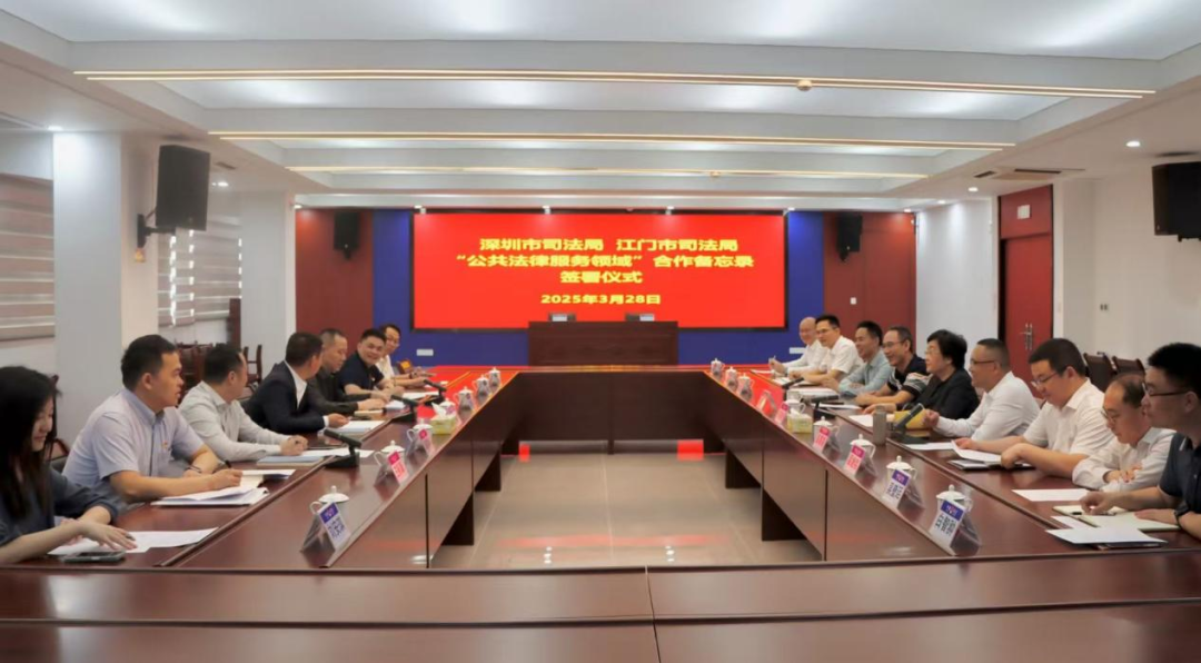 3月28日上午,深圳市司法局、江门市司法局在江门市公共法律服务中心举行"公共法律服务领域"合作备忘录签署仪式。两地司法行政系统以深中通道开通后珠江口东西两岸加快融合发展为契机,聚焦公共法律服务提质增效,共同签署《深圳市司法局 江门市司法局"公共法律服务领域"合作备忘录》,标志着深江两地司法行政合作迈入新阶段。深圳市司法局党委委员、副局长邵宝洲,江门市司法局党组书记、局长芶晓彤,党组成员、市律师行业党委专职副书记彭高宴,党组成员、副局长胡振宇,党组成员、政治处主任翟继铭及两地相关业务部门同志参加活动。
