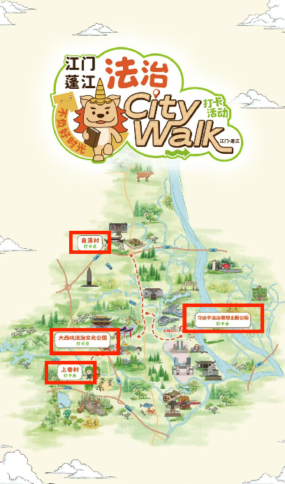 联合江门市司法局扎实推进法治文化阵地打卡活动,依托马拉松公园(法治思想主题公园)、上巷村、良溪村、群星公园(大西坑法治文化公园)四大阵地,以“寓教于乐+实景体验”形式,通过扫码答题、积分兑礼普及法律,实施“线上+线下”精准推广吸引未成年人参与打卡。