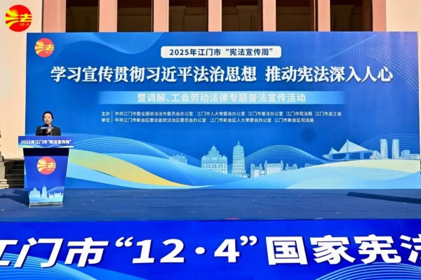 11月29日,江门市“宪法宣传周”暨调解宣传活动启动仪式在新会人民会堂前广场隆重举行。活动由市、区多部门联合主办,40多家单位的普法志愿者齐聚现场,通过文艺展演、宪法宣誓、成果展示等多元形式,彰显“大普法”格局的强大凝聚力,千余名群众参与其中,拉开了全市宣传周活动的序幕。启动仪式后,各县(市、区)司法局紧扣主题,因地制宜开展特色活动。