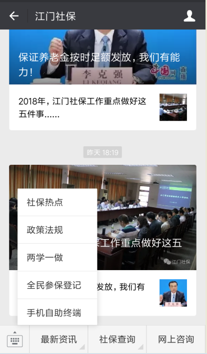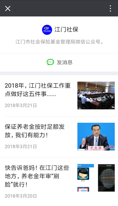 (五)通过微信公众号和政务微博主动公开政府信息情况。2017年,我局共发布微信信息233条、微博信息416条,“两微”渠道群众阅读量超65万次,“江门社保”微信公众号进入了江门市十大政务微信行列,设立“社保查询平台”,为参保人提供了包括个人资料查询、缴费历史查询、社保待遇查询、社保政策、办事指南、门诊选定等多项功能的贴心服务。