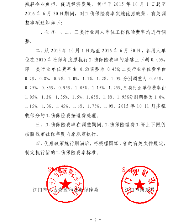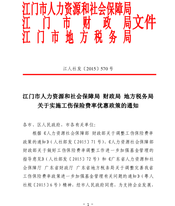 江门市人力资源和社会保障局 财政局 地方税务局关于实施工伤保险费率优惠政策的通知